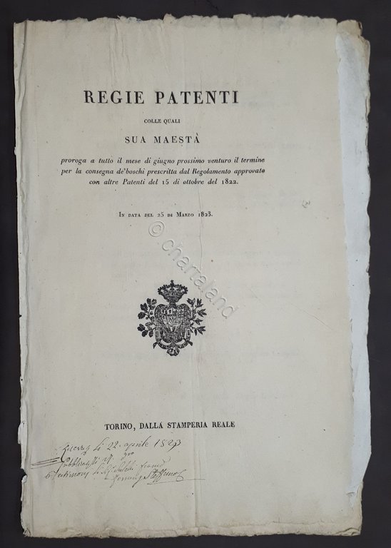 Regie Patenti - Colle quali S. M. proroga a tutto il mese di giugno prossimo venturo il termine per la consegna dèboschi prescritta dal Regolamento approvate con altre Patenti del 15 Ottobre del 1822. In data 25 Marzo 1823 Pagine - 6 Condizioni molto buone