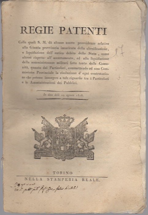 Regie patenti colle quali S.M. dà alcune nuove provvidenze relative alla giunta provvisoria incaricata della classificazione, e liquidazione dell'antico debito dello stato, come altresì rispetto all'accertamento, ed alla liquidazione dele somministranze militari.