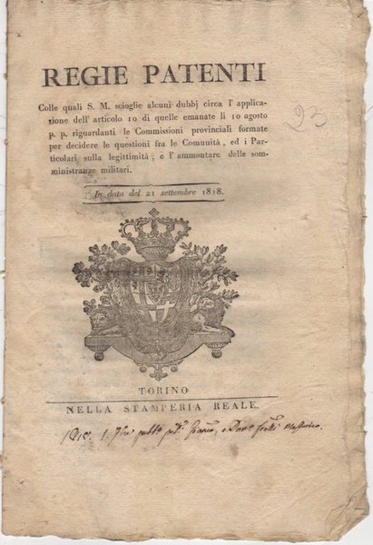 Regie patenti colle quali S.M. scioglie alcuni dubbj circa l'applicazione dell'articolo 10 di quelle emanate li 10 agosto p.p. riguardanti le commissioni provinciali formate per decidere le questioni fra le comunità , ed i Particolari sulla legittimità . e l'ammontare delle somministranze militari.
