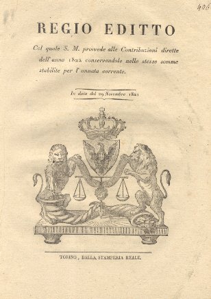 Regio Editto col quale S. M. provvede alle Contribuzioni dirette dell'anno 1822 conservandole nelle stesse comme stabilite per l'annata corrente. 29 novembre 1821.