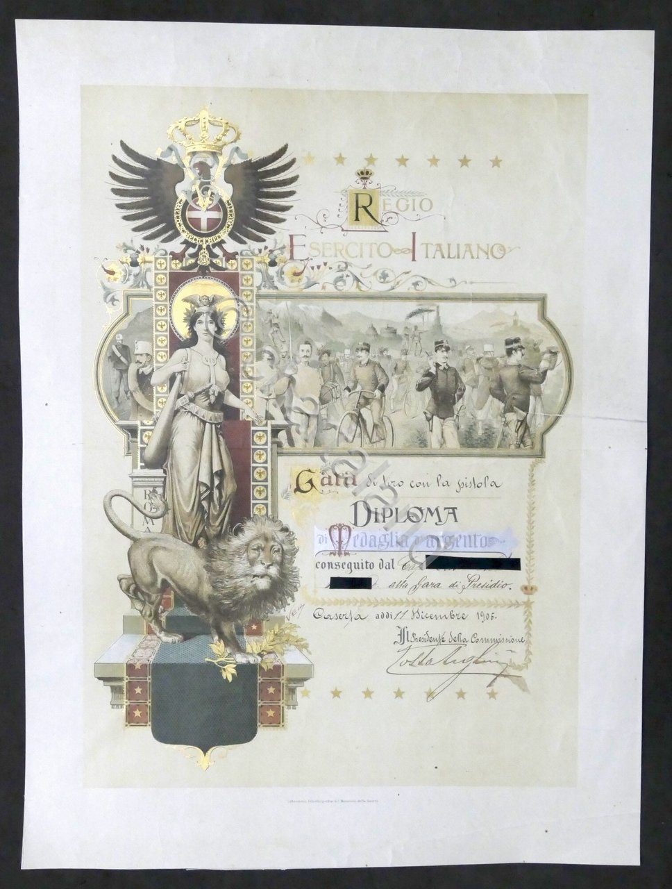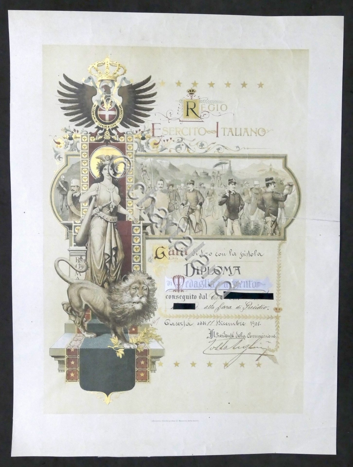 Regio Esercito Italiano - Diploma di Medaglia d'Argento - Gara di tiro con la pistola Datato: Caserta, 11 Dicembre 1906 Dimensioni: 32 x 43 cm ca. Lingua italiana. Buone condizioni generali. Qualche leggera piega.