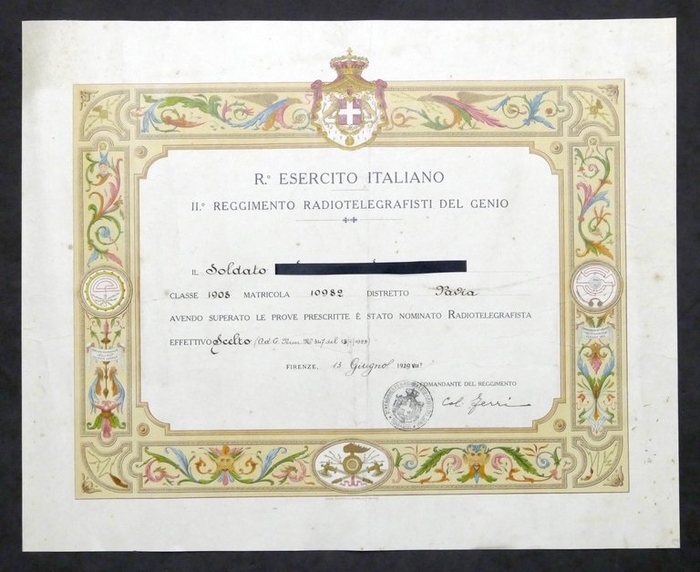 Regio Esercito Italiano Reggimento Radiotelegrafisti del Genio - Diploma - 1929