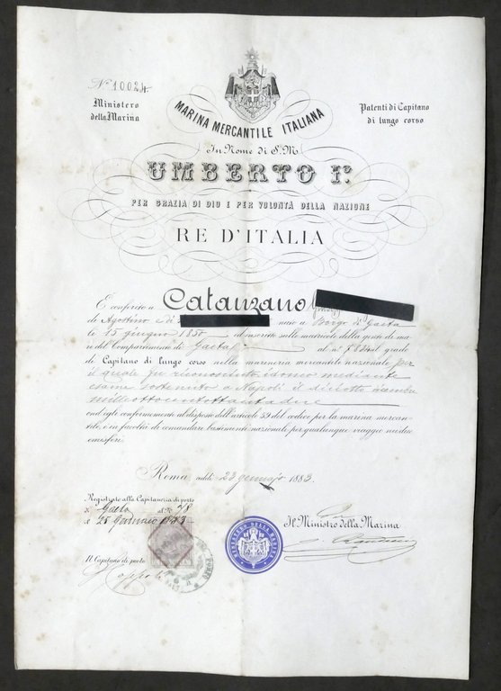 Regno d'Italia - Patente di Capitano di Lungo Corso - Marina Mercantile - 1883
