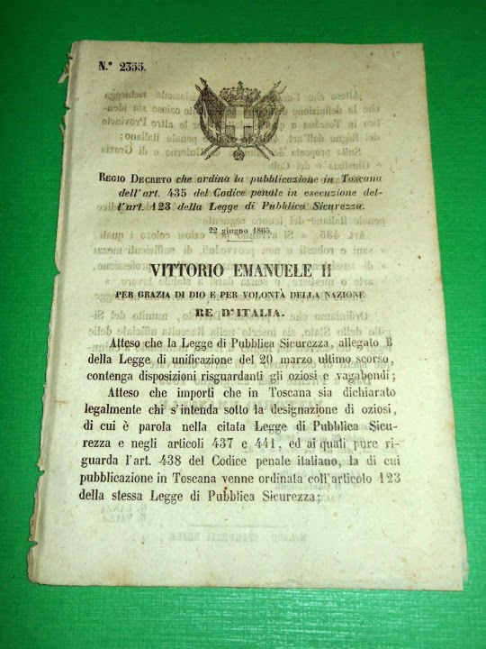 *** Atti del Governo di S. M. il Re d' Italia: "Regio Decreto che ordina la pubblicazione in Toscana dell' art. 435 del Codice penale in esecuzione dell' art. 123 della Legge di Pubblica Sicurezza."Firenze, 22 giugno 1865. Pagine 2.Per appassionati studiosi e collezionisti