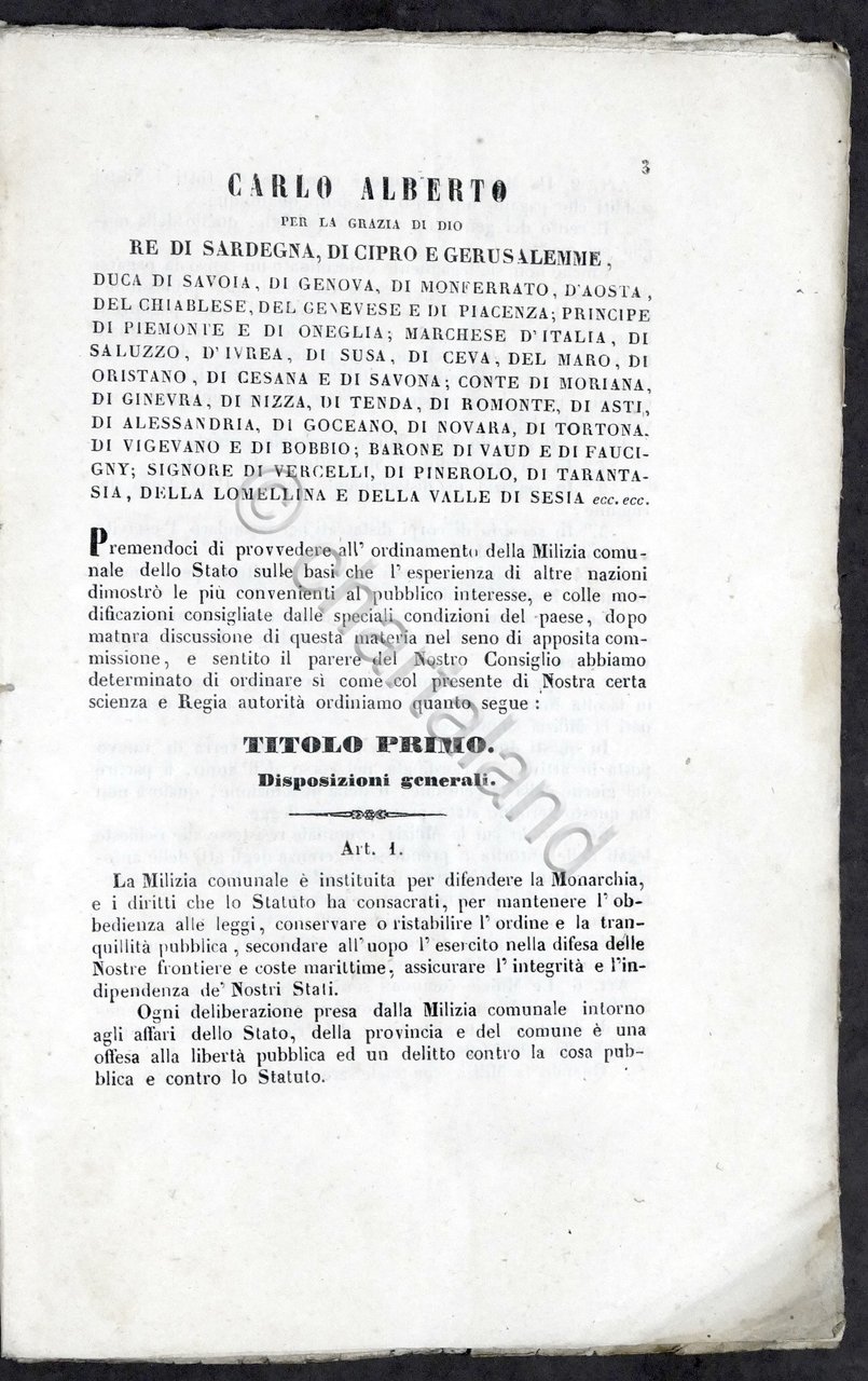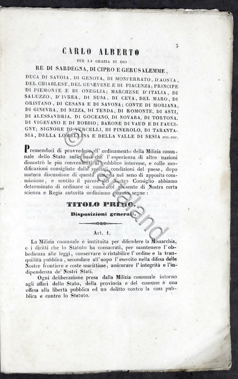 Regno di Sardegna - Savoia - Regio Editto per le Milizie Comunali - marzo 1848