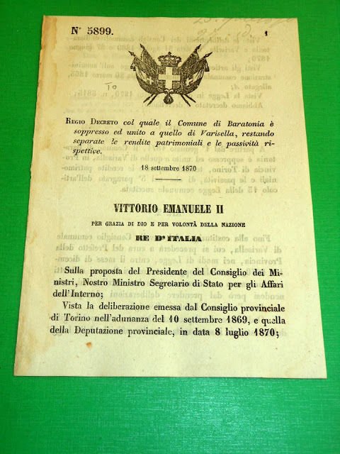 Regno Italia Regio Decreto Comune Baratonia soppresso aggregato a Varisella 1870