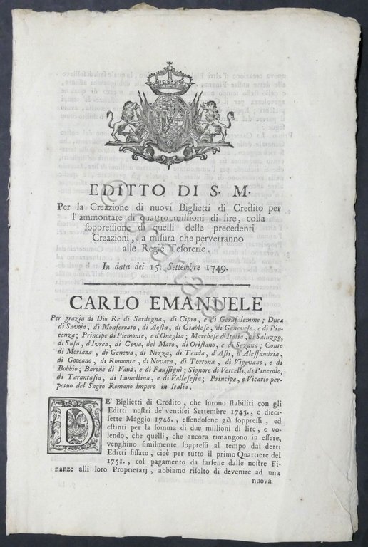 Regno di Sardegna - Editto di Sua Maest&agrave, - Creazione nuovi Biglietti di Credito - 15 Settembre 1749