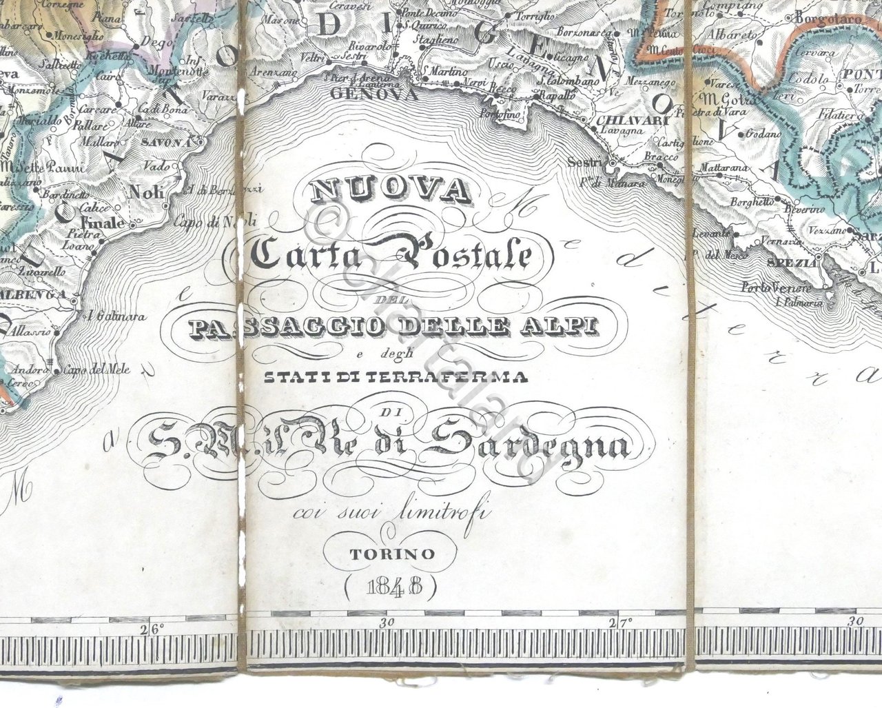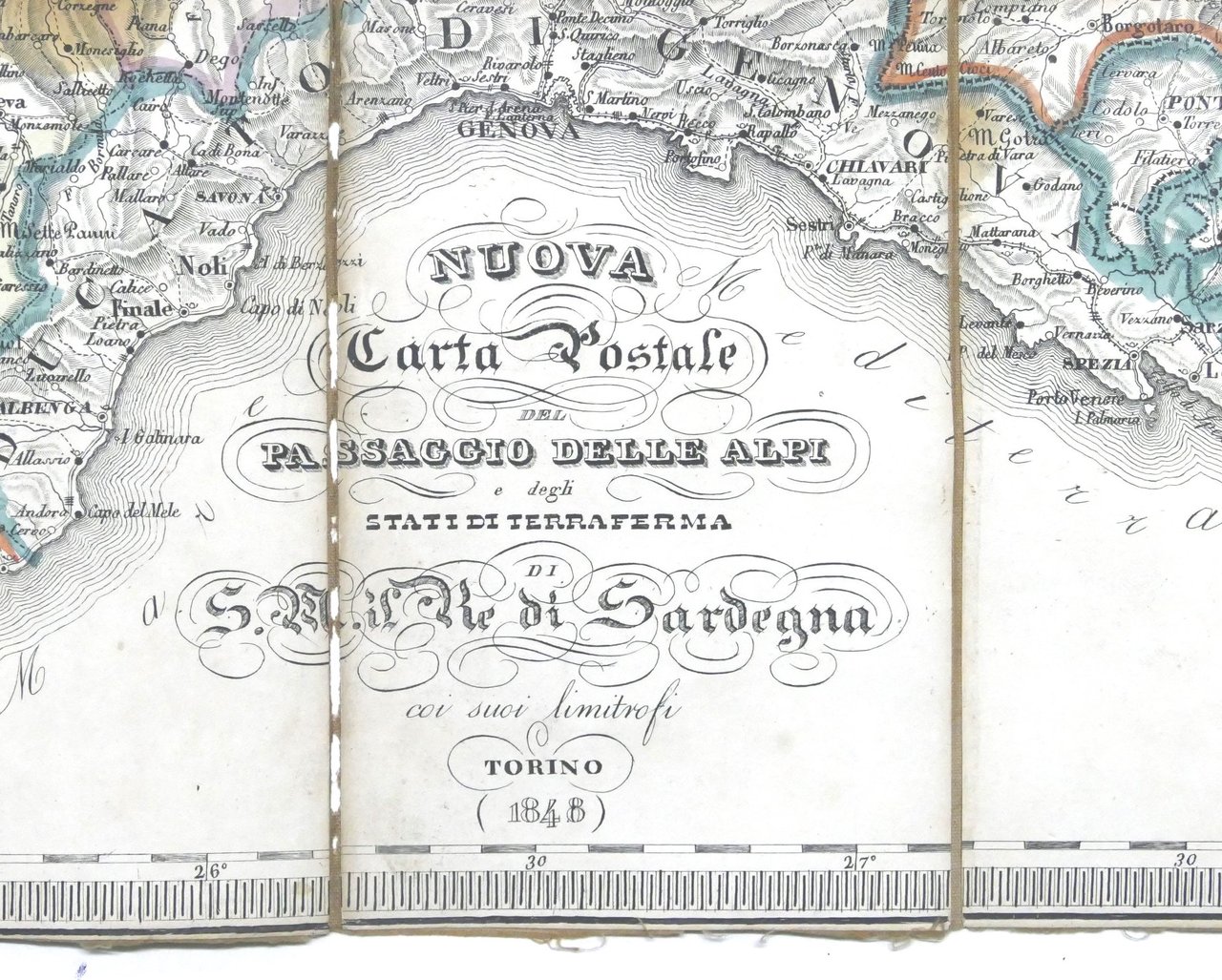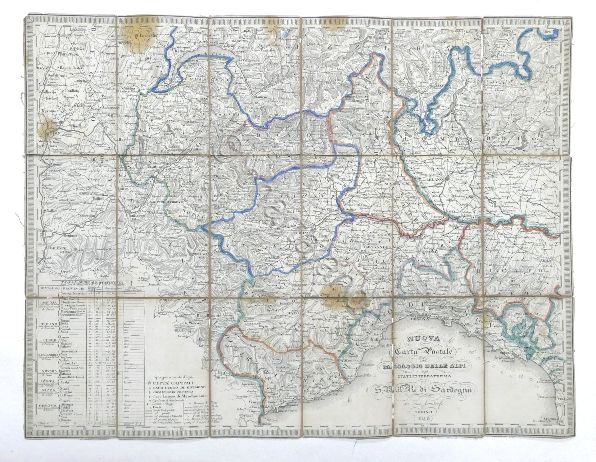 Nuova Carta Postale del Passaggio delle Alpi e degli Stati di Terraferma di S.M. il Re di Sardegna coi suoi limitrofi - Torino 1848 18 pannelli cartacei applicati su tela. Dimensioni: 48 x 62 cm ca. Condizioni buone. Piccoli segni del tempo e qualche lieve macchia come da foto.