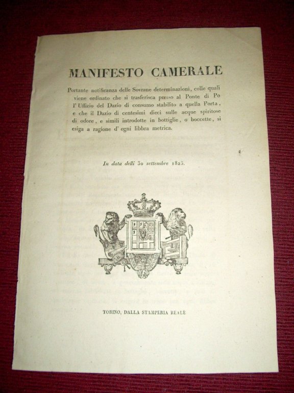 Regno Sardegna Torino Manifesto Camerale Ufficio Dazio Acque Ponte del Po 1823