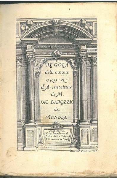 Regola delli cinque ordini d'architettura di M. Jac. Barozzio da Vignola. In Bologna, Nella Stamperia di Lelio dalla Volpe, 1736. Legato assieme: Barozzi Jacopo: La prospettiva pratica delineata in tavole a norma della seconda regola di Giacomo Barozzi d