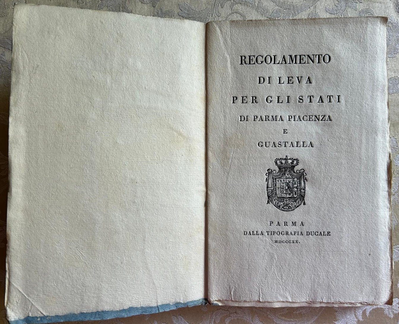 Parma, Dalla Tipografia Ducale, 1820. In-8, brossura muta, pp. 80, seguite da 14 moduli ognuno di alcune pagine, anche ripiegate. In ottimo stato.