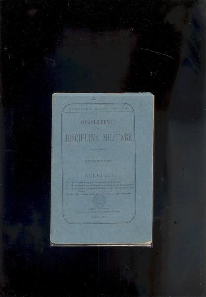 IN 16°, REGOLAMENTO DI DISCIPLINA MILITARE DEL MINISTERO DELLA GUERRA DIVISO IN TRE ALLEGATI. ALLEGATO N.8, ISTRUZIONE PER LA CONCESSIONE DEGLI ATTENDENTI, pp.20. ALLEGATO N.9, LEGGI E REGOLAMENTI SUI MATRIMONI DEI MILITARI, pp.30. ALLEGATO N.10, ISTRUZIONE SULL'IGIENE PER IL REGIO ESERCITO, pp.84, CON UNA ILLUSTRAZIONE in b/n.a pp. COPERTINA IN BROSSURA AZZURRA CON TITOLO. A pg.11 DELL'ALLEGATO N.9, PICCOLA MANCANZA DI CARTA NELLA PARTE BIANCA ESTERNA. FASICOLO COMPLETO CON ERRONEA NUMERAZIONE IN COPERTINA DEGLI ALLEGATI ( INDICATO IL N.7 CHE NON C'E').<BR>OTTIMA CONSERVAZIONE GENERALE. ID 3480