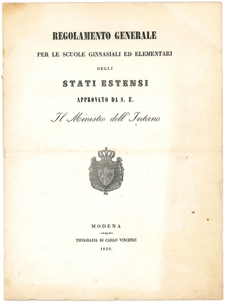 In folio (mm. 300x220). Pp. 11, [1 bianca]. Senza legatura. Frontespizio un po' impolverato sul margine esterno, traccia di piegatura centrale, ma ottima copia. Il sistema scolastico era diviso in ginnasi di prima e seconda classe della durata di anni sei e in scuole elementari. Per ogni classe il Regolamento indica le materie e i rispettivi libri di testo con autore, titolo e spesso anche con editore e data. Ad esempio, per l'analisi di scrittori italiani, S. Muzzi, Cento novelle morali, Modena Rossi, 1849, oppure, per la geografia, Elementi di geografia moderna ad uso delle scuole, Torino, Marietti,1846.