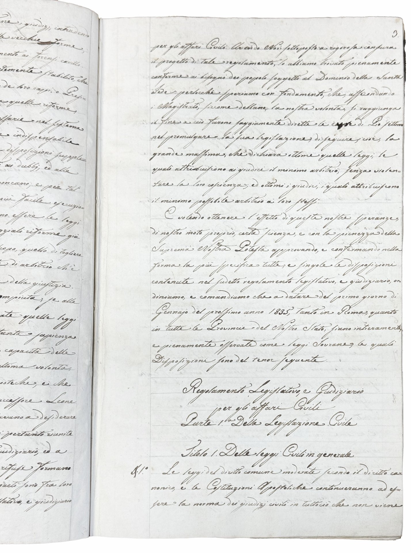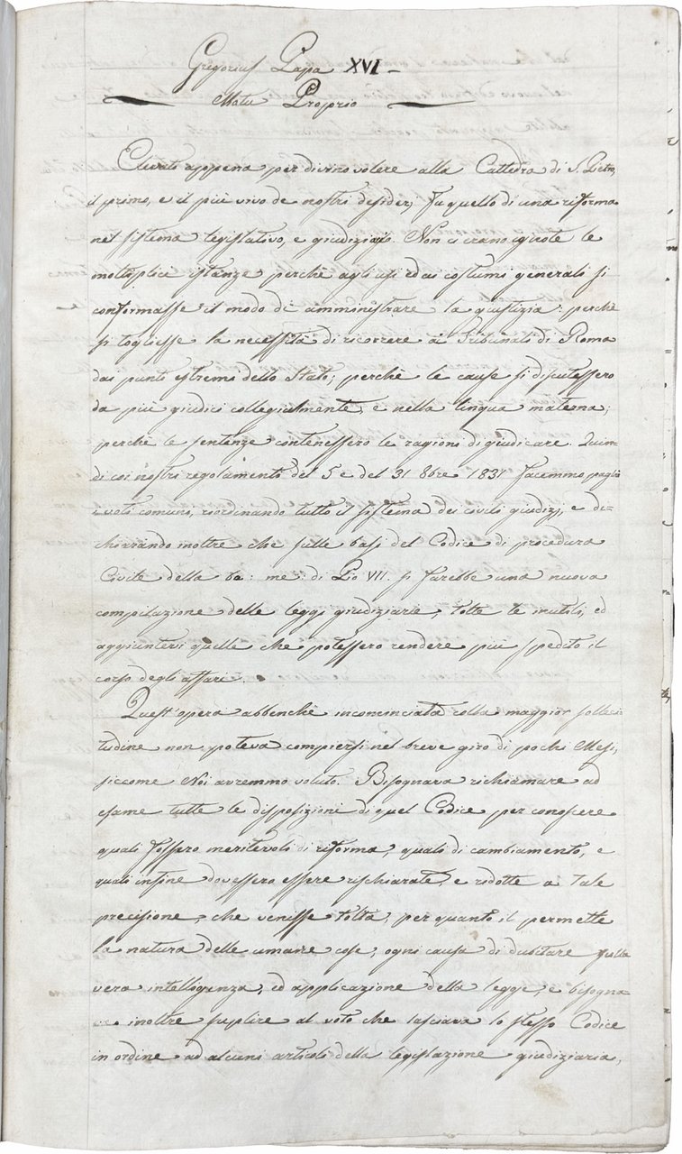 Copia manoscritta, databile all'incirca agli anni in cui fu emanato, del Regolamento Legislativo e Giudiziario per gli Affari Civili di Gregorio XVI, promulgato con “motu proprio” il 10 novembre 1834 e pubblicato a Roma dalla Tipografia Camerale nello stesso anno. Si tratta del punto nodale della riforma legislativa voluta da Gregorio XVI per riordinare il sistema giudiziario e civile dello Stato Pontificio.