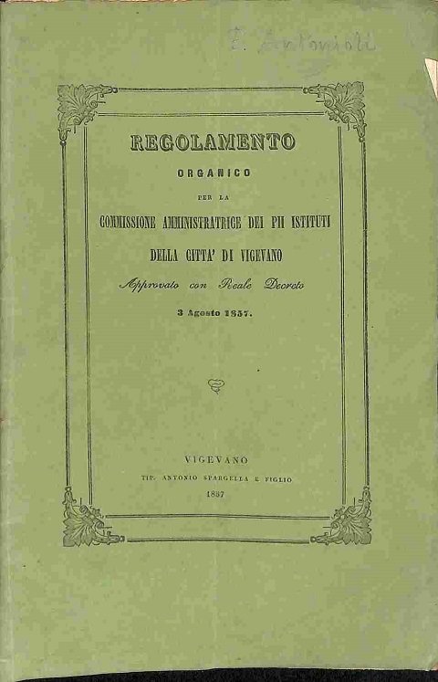 In 8 (cm 16 x 24), pp. 18. Brossura editoriale con lieve mancanza al piatto anteriore. Regolamento organico per la Commissione amministratrice dei Pii Istituti della citta' di Vigevano approvato con reale decreto del 3 agosto 1857.