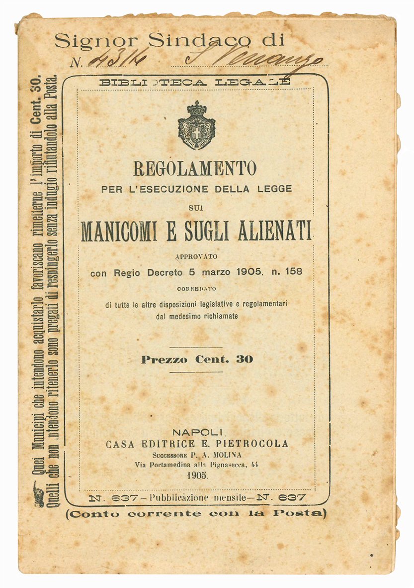 Regolamento per l'esecuzione della legge sui manicomi e sugli alienati approvato con Regio Decreto 5 marzo 1905. n. 158 corredato di tutte le altre disposizioni legislative e regolamentari dal medesimo richiamate.
