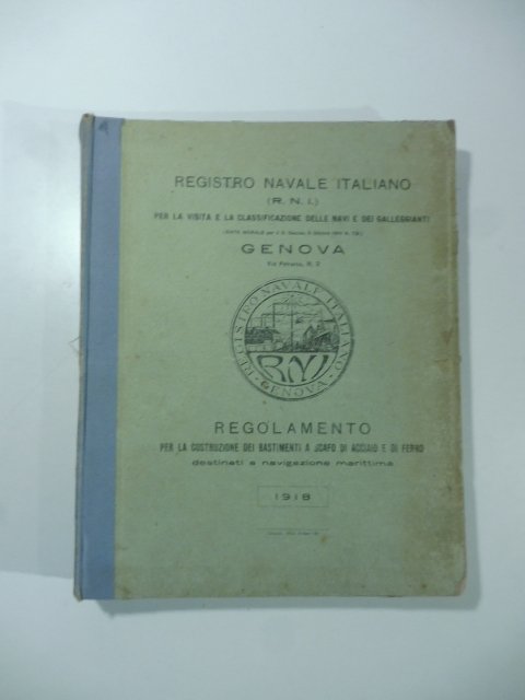 2 voll. legati in uno, in 8 cm. 19,5 x 24,5, pp. XXIII + 211 + (5) + volume di tavole. Legatura a cartella in mezza tela con stemma del Registro Navale Italiano, con segni d'uso e una leggera brunitura al margine esterno. Firma di proprieta' al frontespizio del primo volume e al piatto anteriore del volume delle tavole. A cura del Registro Navale Italiano (R.N.I.) per la visita e la classificazione delle navi e dei galleggianti (Ente Morale per il R. Decreto 9 ottobre 1910 n.731). In generale molto buono.