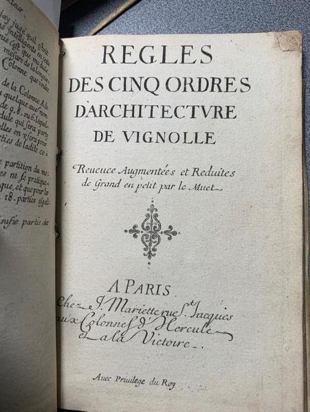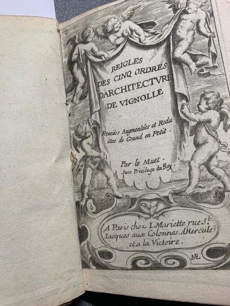 Reigles (sic) des cinq ordres d'architecture de Vignolle revues, augmentées et reduites de grand en petit par Le Muet - Avec Privilège du Roy