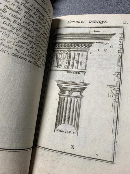 In16° (cm 10 x 16,1), legatura piena pergamena coeva, pp (5), 2-101, antiporta figurata incisa in rame, cinquantum tavole f. t. in rame di cui la prima, raffigurante gli ordini architettonici, non numerata, illustranti: l'ordine toscano, dorico, ionico, corinzio, l'ordine composito, quattordici porte di palazzi tra cui quella del card. Farnese a Caprarola e per l'entrata principale del palazzo della Cancelleria; la porta del Giardino del Duca Sforza; la Porta della Vigna del Patriarca Grimani a Porta Pia; tranne le ultime nove porte, tutte le incisioni con didascalia a fronte. Architetto pratico e teorico del Periodo di Transizione tra gli stili Rinascimento e Barocco (1507-1563), allievo e successore di Michelangelo, le cui opere 'Regole delli cinque ordini d'architettura' (1563) e il postumo 'Due regole della prospettiva pratica', ebbero influenza immensa per secoli. SBN censisce altre edizioni; CCFr censisce altre edizioni, sempre con stampatore Mariette, con numero diverso di pagine, oppure senza indicazioni tipografiche, a cura del traduttore Le Muet, come la nostra, datate 1632 (le edizioni con traduttore Mennessier sono posteriori di qualche anno). Cfr.: P. Renouard, Repertoire des imprimeurs parisiens, 1995, p. 241, per altre edizioni coeve.