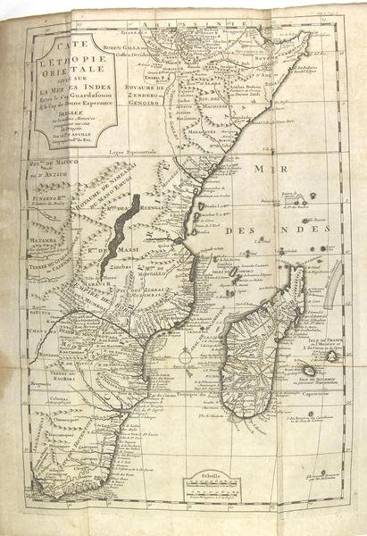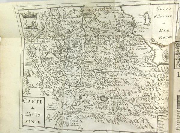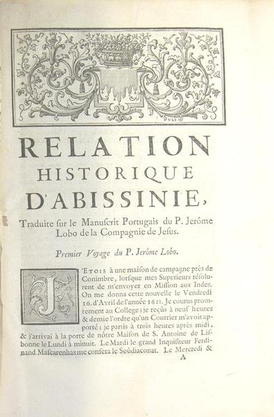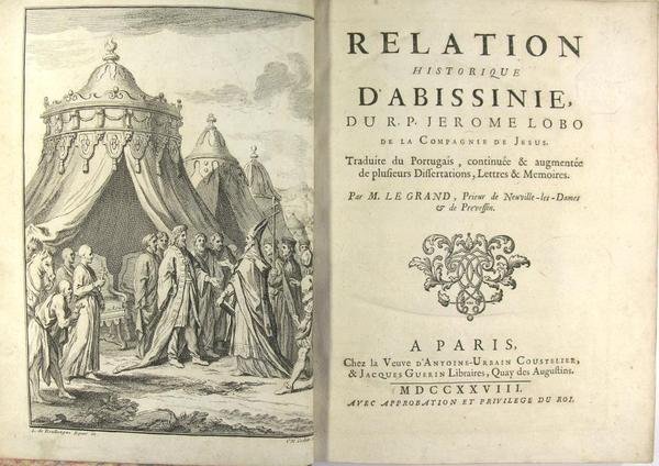 A Paris, chez la veuve d'Antoine Urbain Coustelier & Jacques Guerin libraires, 1728. In-4 (25 x 20 cm) reliure plein veau du temps tacheté, dos à nerfs à caissons dorés et pièce de titre fauve, tranches rouges, frontispice, xiv p., 2 f. n.p., 514 pages., 4 f. de tables, bandeaux, lettrines historiées et culs de lampes, deux cartes rempliées. Coiffe inférieure manquante, coins de la reliure usés, mais reliure solide. Petits trous d'insecte en marge d'un feuillet et de la première carte, sans gravité. Une déchirure sans manque sur la seconde carte, pagination avec erreurs comme souvent (saut de la p. 178 à 183) mais sans manque de texte. 4vo full calf spoted calf binding, ribbed spine with gilt in compartments, red edges, frontispiece, [XIV], [2], 514 p., [4], head-bands, ornamented initials, tailpieces, 2 folding maps. bottom-tip missing, rubbed corners but binding holding firm. A map with small tear without loss of paper. Jerónimo Lobo (Lisbonne 1593 - 1678) prêtre jésuite portugais, missionnaire en Éthiopie il œuvra pour la conversion de l'Église copte éthiopienne au catholicisme, mais sans succès." C’est au milieu du XVIe siècle que les Jésuites arrivèrent en Ethiopie pour évangéliser, avec plus ou moins de bonheur, le pays. Certains en rapportèrent des récits de voyages, ce fut le cas du Père Jérôme Lobo (1593-1678) dont la « relation » connut une certaine célébrité puisqu’elle fut notamment traduite en français et en anglais, fut reproduite dans plusieurs recueils de voyages réalisés par des érudits de la République des Lettres et inspira le Rasselas de Samuel Jonhson, l’équivalent anglais du Candide de Voltaire." (CRLV).