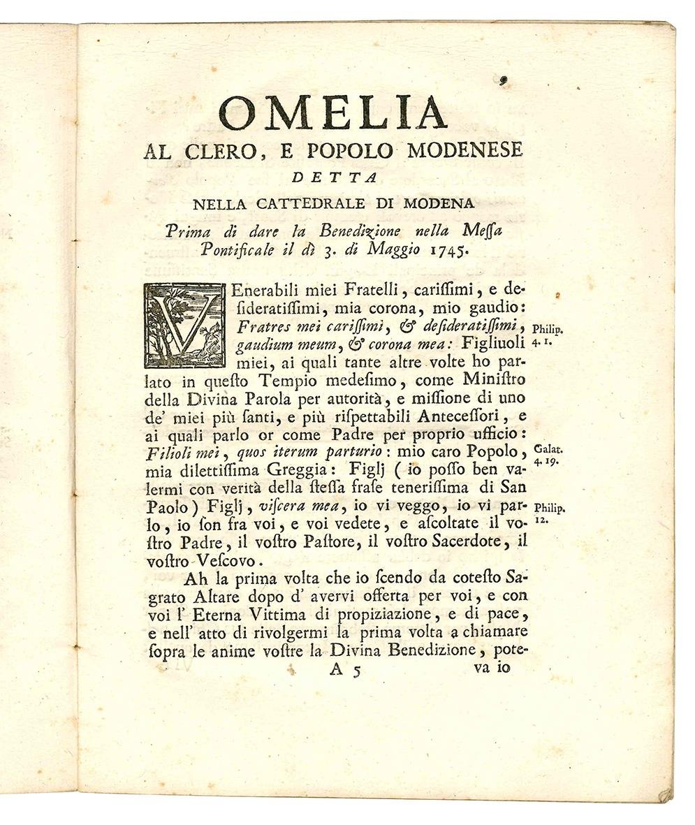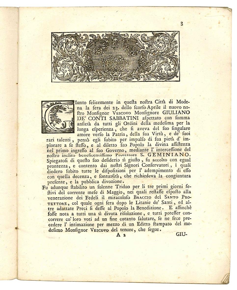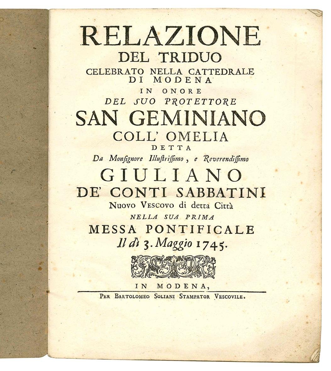 Relazione del triduo celebrato nella cattedrale di Modena in onore del suo protettore San Geminiano coll'omelia detta da Monsignore Illustrissimo, e Reverendissimo Giuliano de' conti Sabbatini Nuovo Vescovo di detta Città nella sua prima messa pontificale Il di 3. maggio 1745.