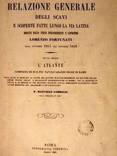 RELAZIONE GENERALE DEGLI SCAVI E SCOPERTE FATTE LUNGO LA VIA LATINA Redatta dallo stesso interprete e scopritore dall’Ottobre 1857 all’Ottobre 1858. Roma Tipografia Tiberina, Marzo 1859.