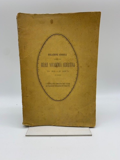 In 8, cm 17 x 25, pp. 92  che comprendono tavole di allegati. Veduta dell'edificio incisa all'acquaforte all'antiporta. Brossura editoriale polverosa con qualche danno riparato. Edizione originale. Storia delle vicende dell'Accademia a partire dal 1652 fino al 1872. Stato presente dell'insegnamento. Influenza dell'Accademia Albertina nell'arte italiana. Elenco del corpo accademico (tra questi Pasini, Hayez, Sacheri, Fontanesi ecc.). Elenco degli artisti piemontesi dell'ultimo ventennio. Societa' delle belle arti in Torino. Specchio statistico delle pubbliche esposizioni della Societa' Promotrice di Belle arti. Circolo degli artisti. L'acquaforte. Societa' d'artisti italiani in Torino. indice delle tavole ecc.