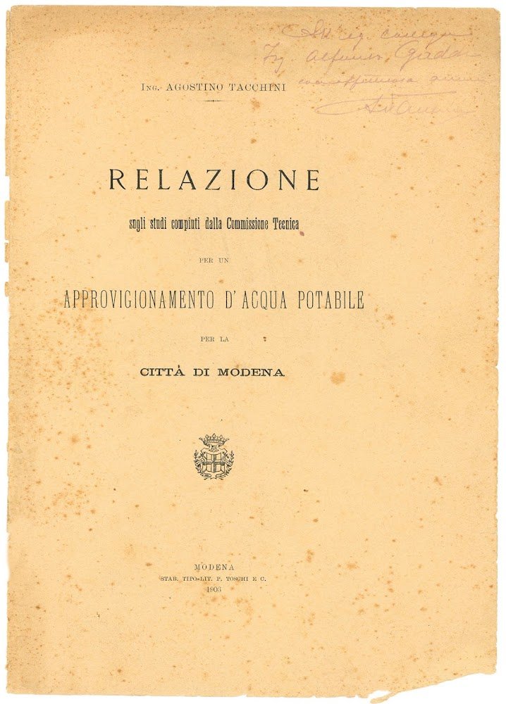 Relazione sugli studi compiuti dalla Commissione tecnica per un approvigionamento d'acqua potabile per la città di Modena