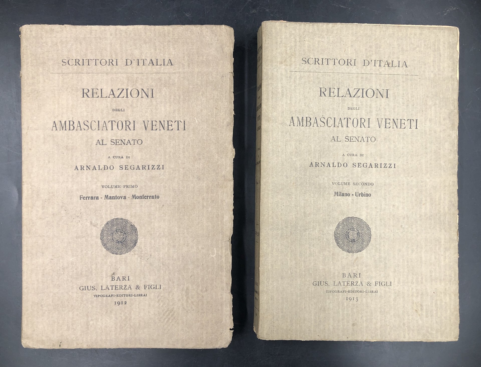 RELAZIONI degli AMBASCIATORI VENETI al Senato. Vol. I: FERRARA, MANTOVA, MONFERRATO. Vol.II: MILANO, URBINO. Coll. Scrittori d'Italia, 36, 49.