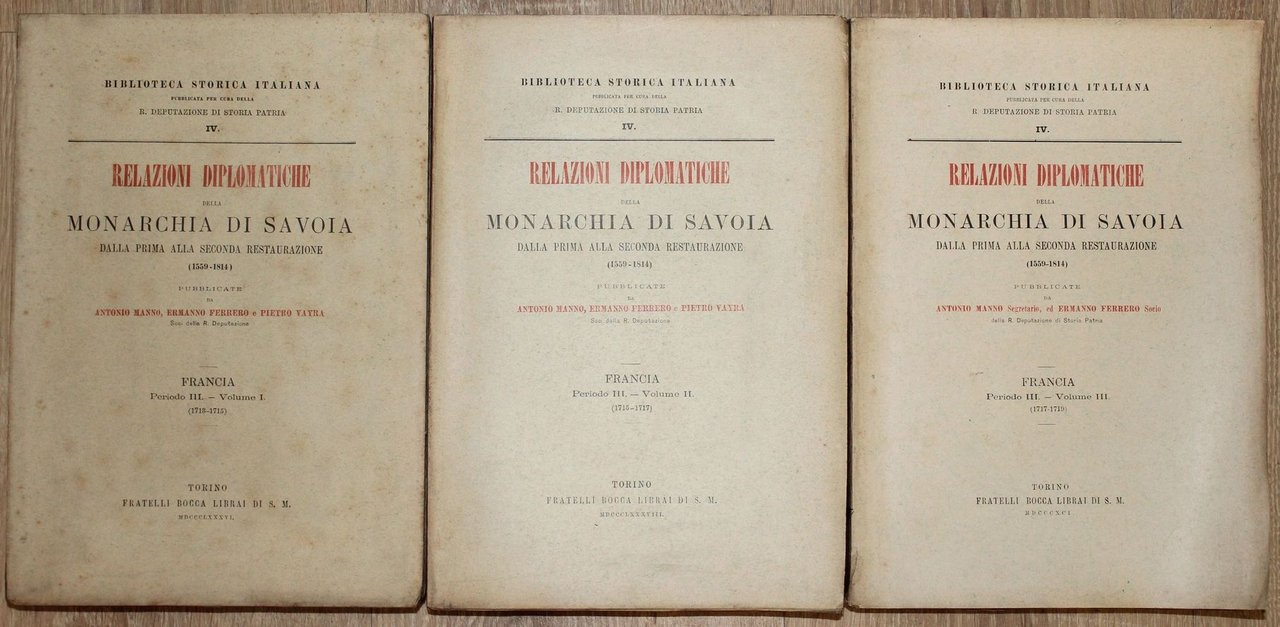 Relazioni diplomatiche della Monarchia di Savoia dalla prima alla seconda restaurazione (1559-1814). Periodo III - Volumi I-II-II (1713-1719) | Libri antichi e moderni | Manno, Antonio - Ferrero, Ermanno