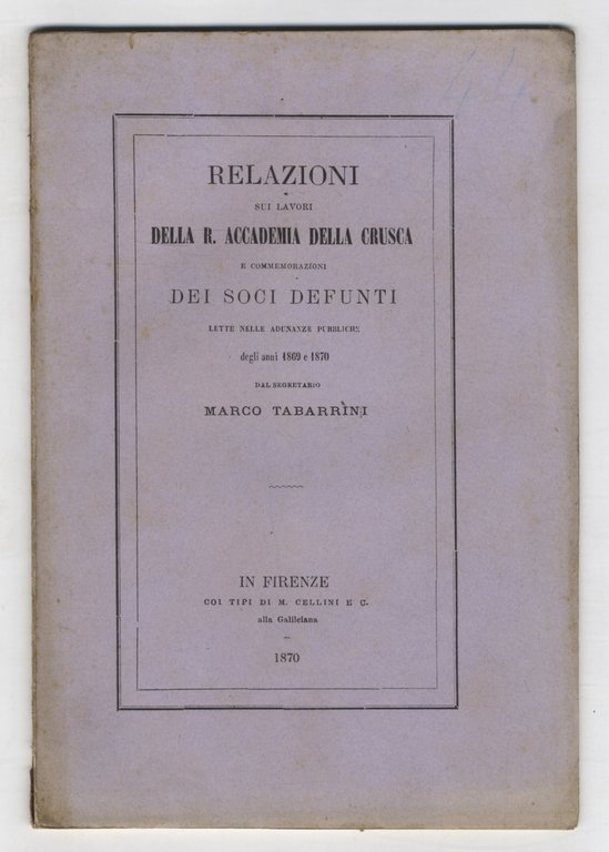 Relazioni sui lavori della R. Accademia della Crusca e commemorazioni dei soci defunti lette nelle adunanze pubbliche degli anni 1869 e 1870.