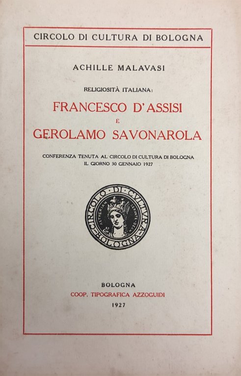 Conferenza tenuta al Circolo di Cultura di Bologna il giorno 30 Gennaio 1927. in ottavo leg. bross. pp. 32 Buono (Good) Es. accettabile, segni del tempo.
