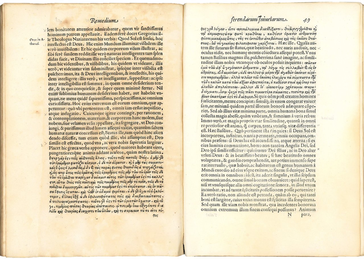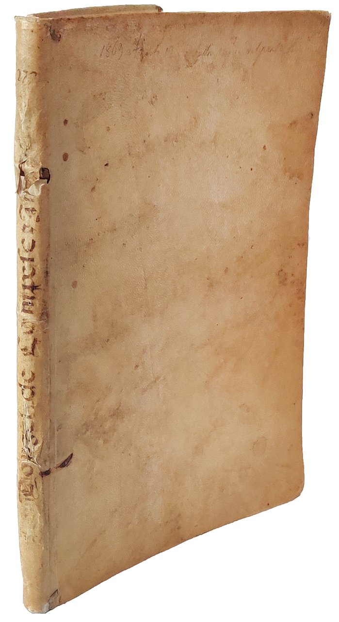 In 4to (mm. 245x175). Cc. [8], 55, [1 bianca]. Segnatura: *-**4 A-O4. Marca tipografica al titolo. Caratteri tondi e greci. Pergamena floscia coeva con titolo manoscritto lungo il titolo e al margine inferiore (piccole mancanze al dorso). Segno di tarlo abilmente restaurato al margine interno di alcune carte all'inizio del volume, alcuni fascicoli un po' bruniti, nel complesso ottima copia estremamente genuina e marginosa.