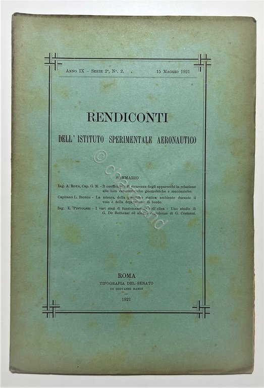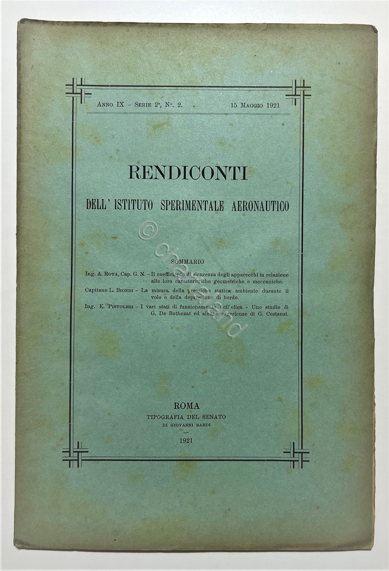 Rendiconti dell'Istituto Sperimentale Aeronautico N. 2 - 15 Maggio 1921 Testo in lingua italiana. Pagine 30 ca. con illustrazioni e tavole. Copertina morbida. Condizioni molto buone.