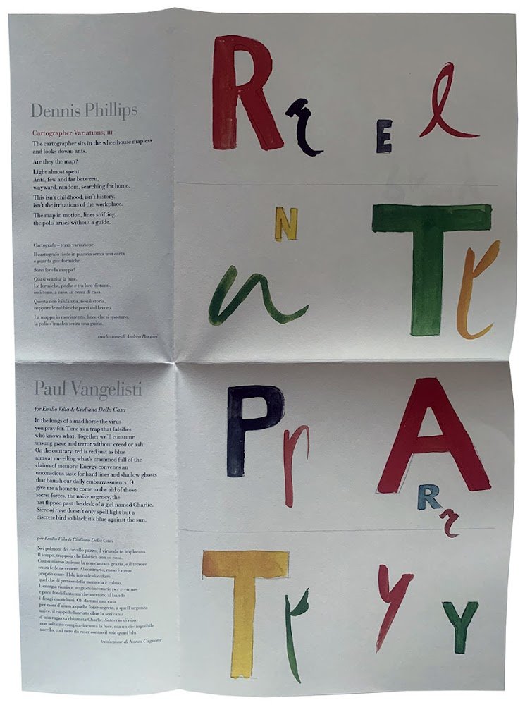 Mm. 480x360. Folding illustrated broadsheet, loosely preserved in illustrated boards. Dennis Philipps: Cartographer Variations, III. Paul Vangelisti: For Emilio Villa & Giuliano della Casa. Design: Bosio Associati. Printed by L'Artistica Savigliano. Signed in pencil by Della Casa under the initials “P.Y.” painted by him in red. First edition.