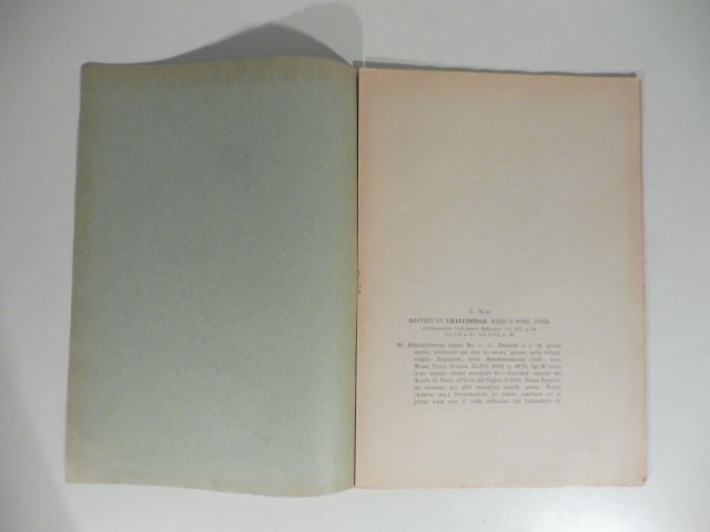 In 8 (cm 17,5 x 25), pagine numerate da 162 a 164 + bifoglio sciolto + foglio sciolto. Brossura muta coeva. Un opuscolo di 4 pagine + 1 foglio sciolto + 1 bifoglio sciolto. Estratti editoriale dal Bollettino della Societa' entomologica italiana. Contiene il catalogo numerato di chalcididae rare o poco note. Il catalogo contiene le specie che vanno dai numeri 1-20; 35-54.