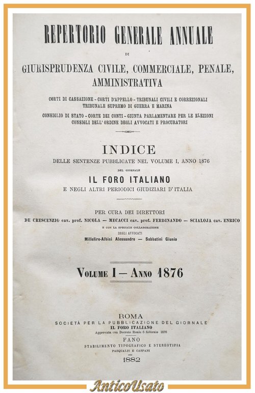 REPERTORIO GENERALE ANNUALE DI GIURISPRUDENZA 1876 volume I 1882 libro antico