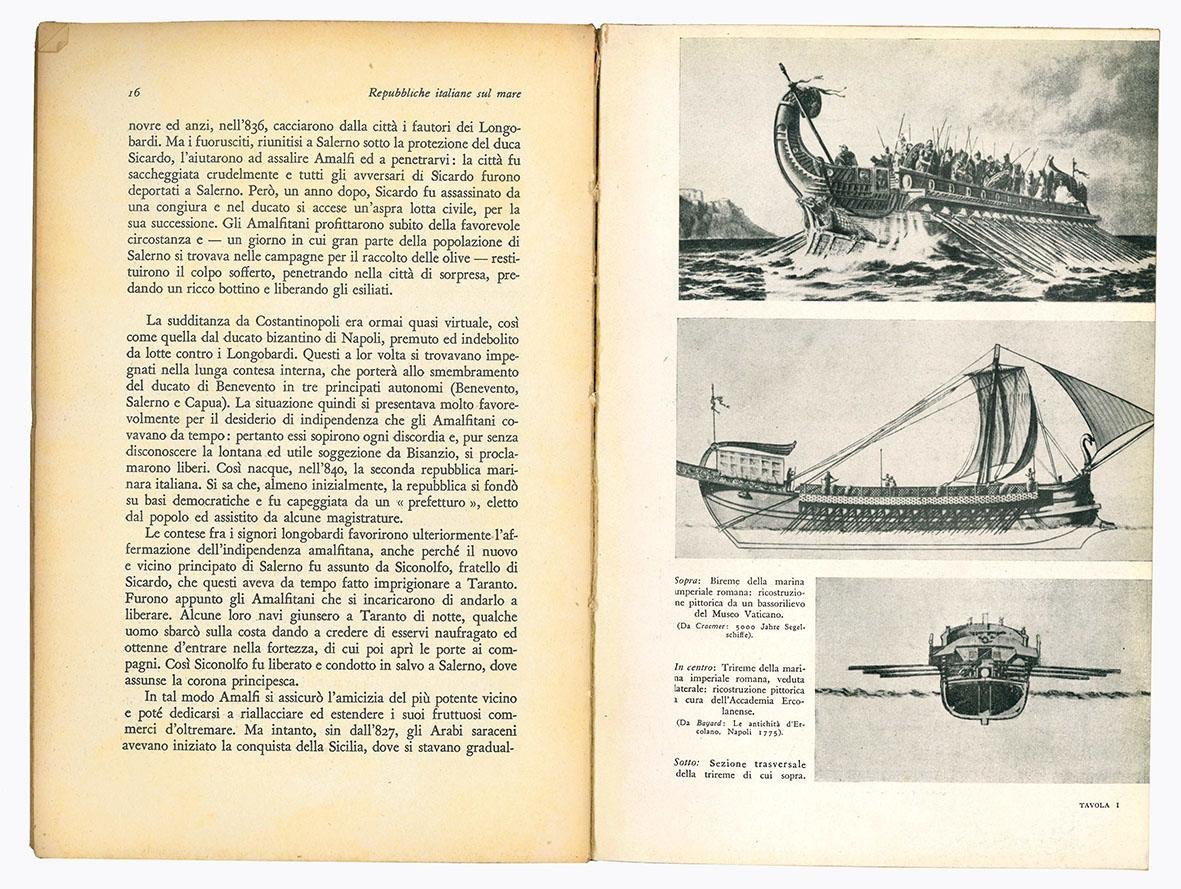 In 8vo (mm 232x154), pp. [4], 278, [2], 24 c. di tav. fuori testo. Occhietto, frontespizio stampato in rosso e nero. Quarantadue illustrazioni nel testo e cinquantuno illustrazioni nelle tavole fuori testo. Finalini. Carta leggermente e marginalmente brunita. Brossura editoriale blu con stemmi delle repubbliche marinare. Minime mancanze alle cuffie. Conservato solo il piatto anteriore della sovraccoperta.