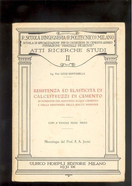 IN 8° ( cm.25,5 X 18 ), pp.47, COPERTINA EDITORIALE CON TITOLO IN ROSSO ENTRO CORNICE<BR>+ 7 TAVOLE in b/n. f.t. E' IL VOLUME SECONDO DI :" ATTI, RICERCHE, STUDI " DELLA R. SCUOLA D'INGEGNERIA ( R.POLITECNICO ) MILANO, SCUOLA DI SPECIALIZZAZIONE PER LE COSTRUZIONI IN CEMENTO ARMATO FONDAZIONE " FRATELLI PESENTI ". ALL'INIZIO, NECROLOGIA DEL PROF. F.A. JORINI CON RITRATTO. OTTIMA CONSERVAZIONE.ID 2607