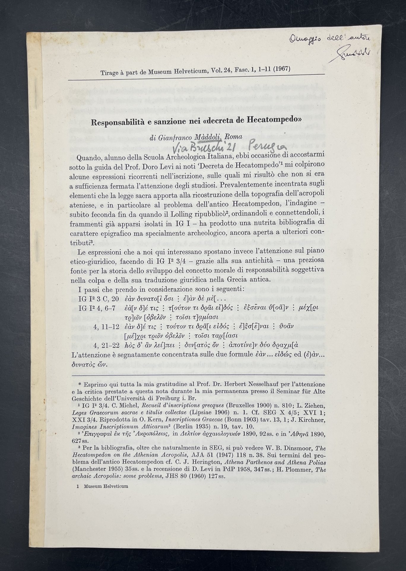 RESPONSABILITà e sanzione nei "Decreta de HECATOMPEDO". Tirage à part se Museum Helveticun, vol. 24, fasc. 1m 1.11. /1967). (Epigrafe GIURIDICA nel tempio di Atena del VI secolo a. C, predecessore del Partenone).