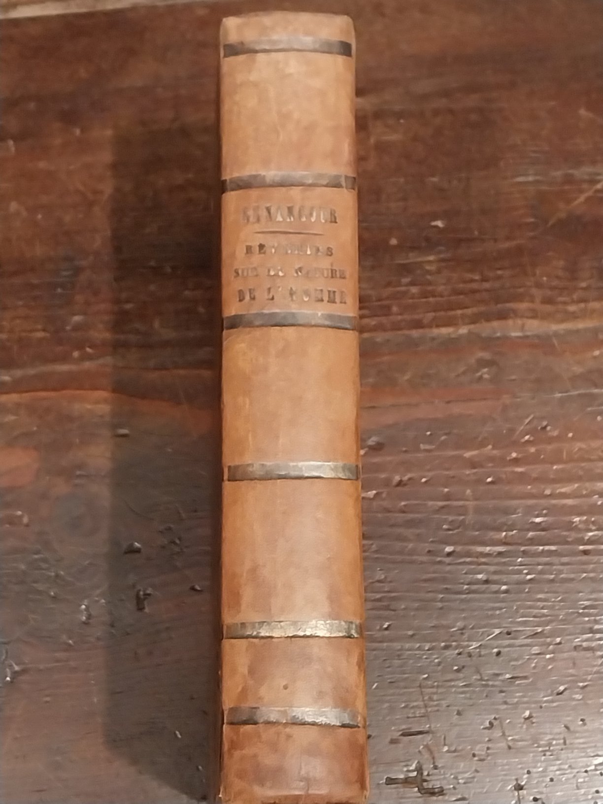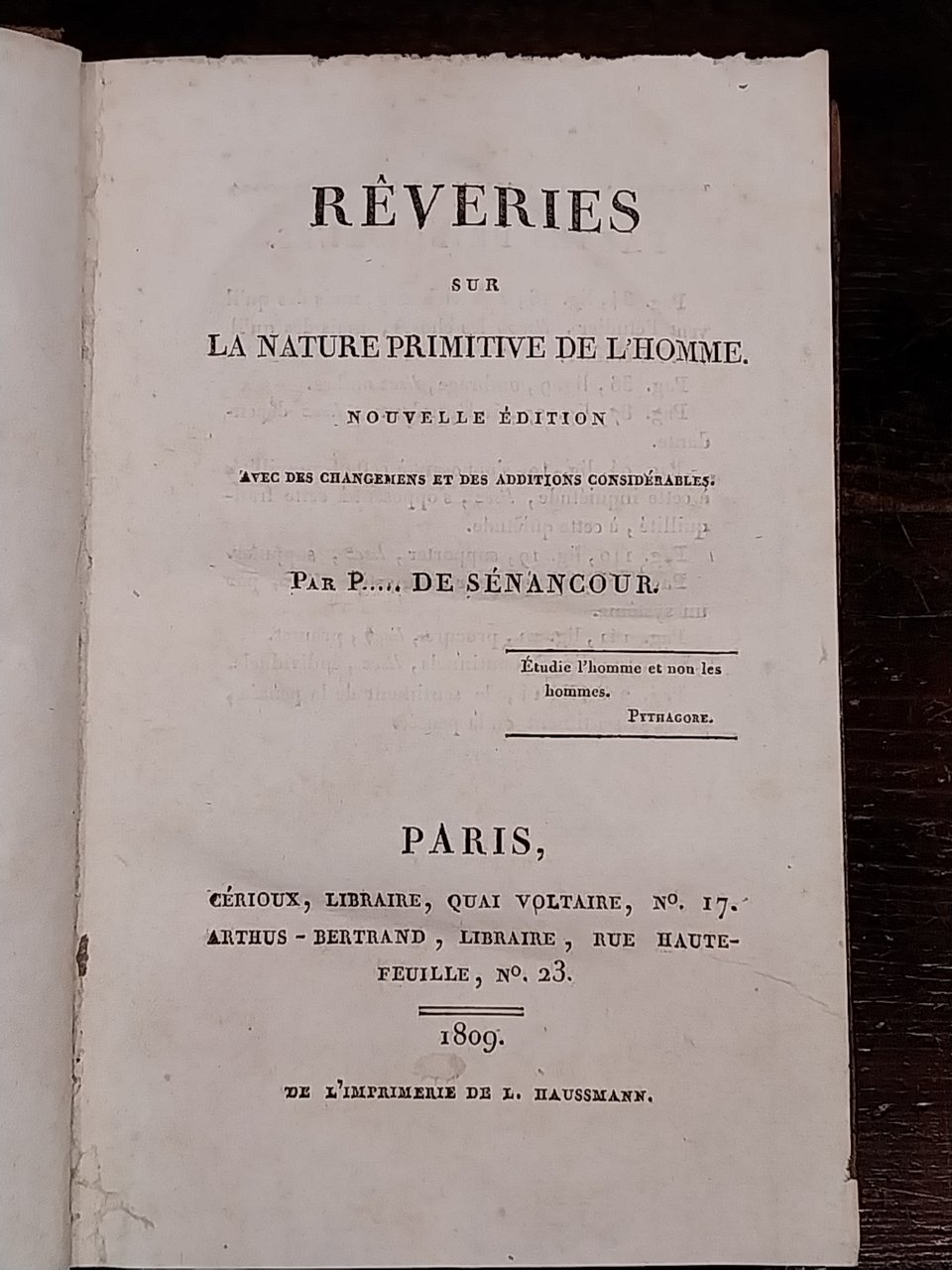 In-8° (19,5 12,5 cm.), pp. (4), 371, mezza pelle coeva, titolo in oro al dorso. Ottimo esemplare, fresco su carta forte con una tonalità leggermente azzurrina. Scrittore francese (Parigi 1770 - Saint-Cloud 1846); era stato destinato dal padre, ricco funzionario, a divenire prete, ma fuggì in Svizzera. Rientrato in Francia sotto il Direttorio, visse poi a Parigi poveramente. Sotto l'influsso di Rousseau, compose le Rêveries sur la nature primitive de l'homme (1799). In quest'opera manifestò un disperato pessimismo sul mondo moderno e sulla civiltà, in nome di un favoloso stato primitivo idilliaco dell'umanità. Fu però contrario alla Rivoluzione, nemico di Napoleone; e contemporaneamente avversario di Châteaubriand, assolutamente scettico in religione, sentimentale, morbosamente incline alle fantasticherie. Fu un precursore del romanticismo.