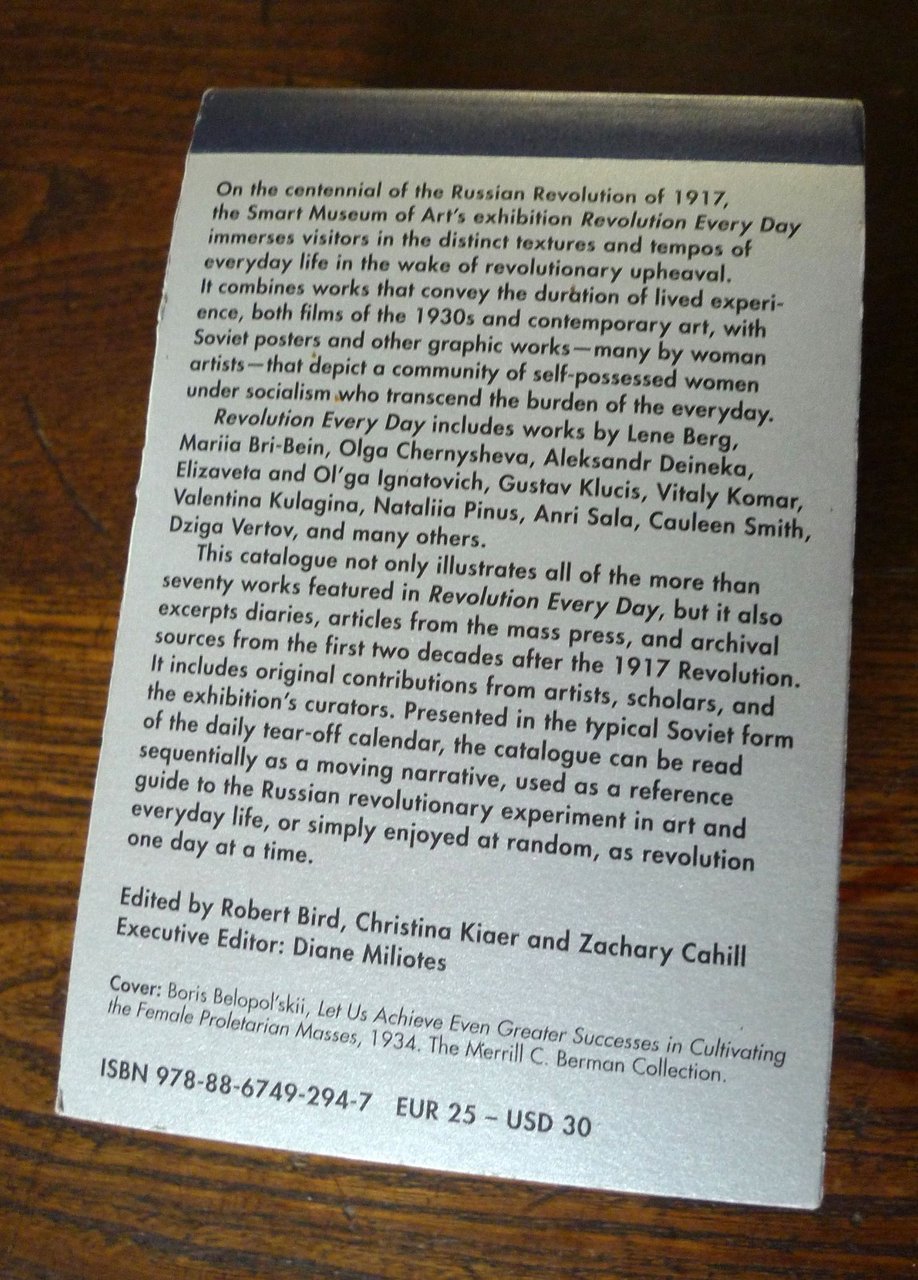 REVOLUTION EVERY DAYA CALENDAR1917-2017 Edited by Robert Bird, Christina Kiaer and Zachary Cahill.Executive Editor: Diane Miliotes.Published on the occasion of the eponymous exhibition at the Smart Museum of Art, Chicago, from September 14, 2017, to January 28, 2018.Mousse Publishing, Milano 2017,brossura, 16,5x11 cm., pp.800,illustrazioni in nero e a colori,comes with four different covers, distributed randomly,testo in inglese,ISBN 978-88-6749-294-7,peso: g.800cod.9928CONDIZIONI DEL LIBRO: come nuovodalle note editoriali:The exhibition Revolution Every Day juxtaposes works of Soviet graphicart—primarily posters from the 1920s and 1930s, many by female artists such asValentina Kulagina—with works on video and film, including excerpts from DzigaVertov’s documentary films from the 1930s, post-Soviet videos by artists like OlgaChernysheva, as well as a new commission by Cauleen Smith. Focused on theexperiences of women under (and after) communism, these works involve viewersin visual and aural conversations concerning the temporality of the everyday,revealing how socialist labor involves feats of endurance and patience as much asheroic action. Revolution Every Day undermines our readymade responses to theRussian Revolution and makes it possible for Western audiences to experienceSoviet visual art anew.This unique, small format companion to the exhibition, published in collaborationwith the Smart Museum of Art (Chicago), is inspired by the tradition of Soviet tear-off calendars. The book has 365 calendar pages with daily entries featuring a rangeof images and texts drawn from primary and archival source materials that explorethe historical and experiential dimensions of revolution. It presents multiple shortessays and other original contributions from the curators, artists, and scholars,accompanied by full color illustrations of all of the works in the exhibition.