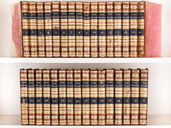 Troisième édition, 33 vol. in-8 reliure de l'époque demi-basane marron, dos lisse orné, Au Bureau du Journal, Chez Dondey-Dupré Père et Fils, Paris, 1825-1830 avec nombreux tableaux dépliants Rare série bien complète des trente tomes de la première série, auxquels on joint les 3 premiers tomes de la deuxième série. La série complète comptera au total 10 séries et 365 tomes ! Série passionnante pour l'histoire du temps, abordant tous les sujets : on passe de l'étude du Code pénal en Chine, à une étude sur les bédouins et les Wéchabites, de la situation politique de la Pologne à la nouvelle organisation de l'armée ottomane, d'esquisses sur l'Inde à un essai sur la situation économique d'Haïti, etc. Etat très satisfaisant (plusieurs accrocs en dos et coupes avec qq petits manques, plats frottés, qq. mouill., mais de manière générale un très bon état intérieur et un exemplaire décoratif).