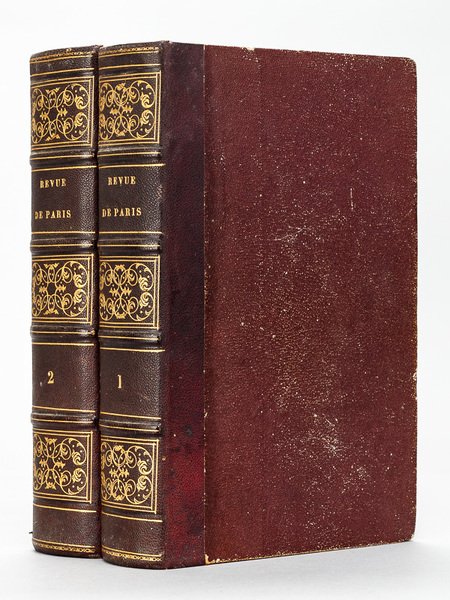 2 vol. fort in-8 reliure demi-chagrin bordeaux, dos à 4 nerfs dorés richement orné, Revue de Paris, s.d. (circa 1830-1833) Revue de Paris (2 Volumes de recueils d'articles vers 1830-1831-1832-1833) Volume I [ Contient notamment : ] La Vie de Londres ; Le croup par Léon Gozlan ; Souvenirs de Voyage : Strasbourg par Xavier Marmier ; Les Doctrinaires par Lady Morgan ; Le quartier Saint-Jacques et la Chaussée d'Antin ; Les français devant Anvers par Montigny ; Controverse sur les pestiférés de Jaffa ; Lettre de M. le Vicomte de Chateaubriand à M. le Directeur de la Revue de Paris ; Fragments inédits de Lord Byron ; Discours de réception de M. Cousin ; Grégoire de Tours ; Chantilly par Léon Gozlan ; etc. ; Volume II [ Contient notamment : ] Les prédicateurs du Carême par Philarète Chasles ; L'Angelo de Victor Hugo, par Granier de Cassagnac ; Discours de Réception de M. de Lamartine ; Confession d'un gentilhomme Irlandais ; De l'Imprimerie sur la Civilisation par Charles Nodier ; Recherches sur l'origine du recueil intitulé Les Mille et une nuits ; De l'audience accordée par Charles X à Victor Hugo ; Voyage en Auvergne. Saint-Flour, par Charles Nodier ; Histoire des Treize par Balzac ; Poésie. Paganini par Marcelline Desbordes-Valmore Recueil éclectique d'articles publiés dans la Revue de Paris de 1830 à 1833 (essentiellement en 1832), dont l'édition pré-originale de Ferragus (première partie de l'Histoire des Treize) par Honoré de Balzac. Bon exemplaire bien relié (dos très lég. passé, infime piq. à un mors, qq. petits défauts à qq. ff.), de belle présentation