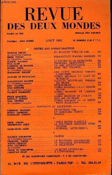REVUE DES DEUX MONDES N�8 - NOTRE AMI ANDRE MAUROIS. MAURICE DRUON de l�Acad�mie fran�aise. UN BOUQUET VERS LE CIEL .HENRI TROYAT de l'Acad�mie fran�aise. PERMANENCE D�ANDRE MAUROIS. CLAUDE MAURIAC . LE RELIRE ET LE RETROUVER . .