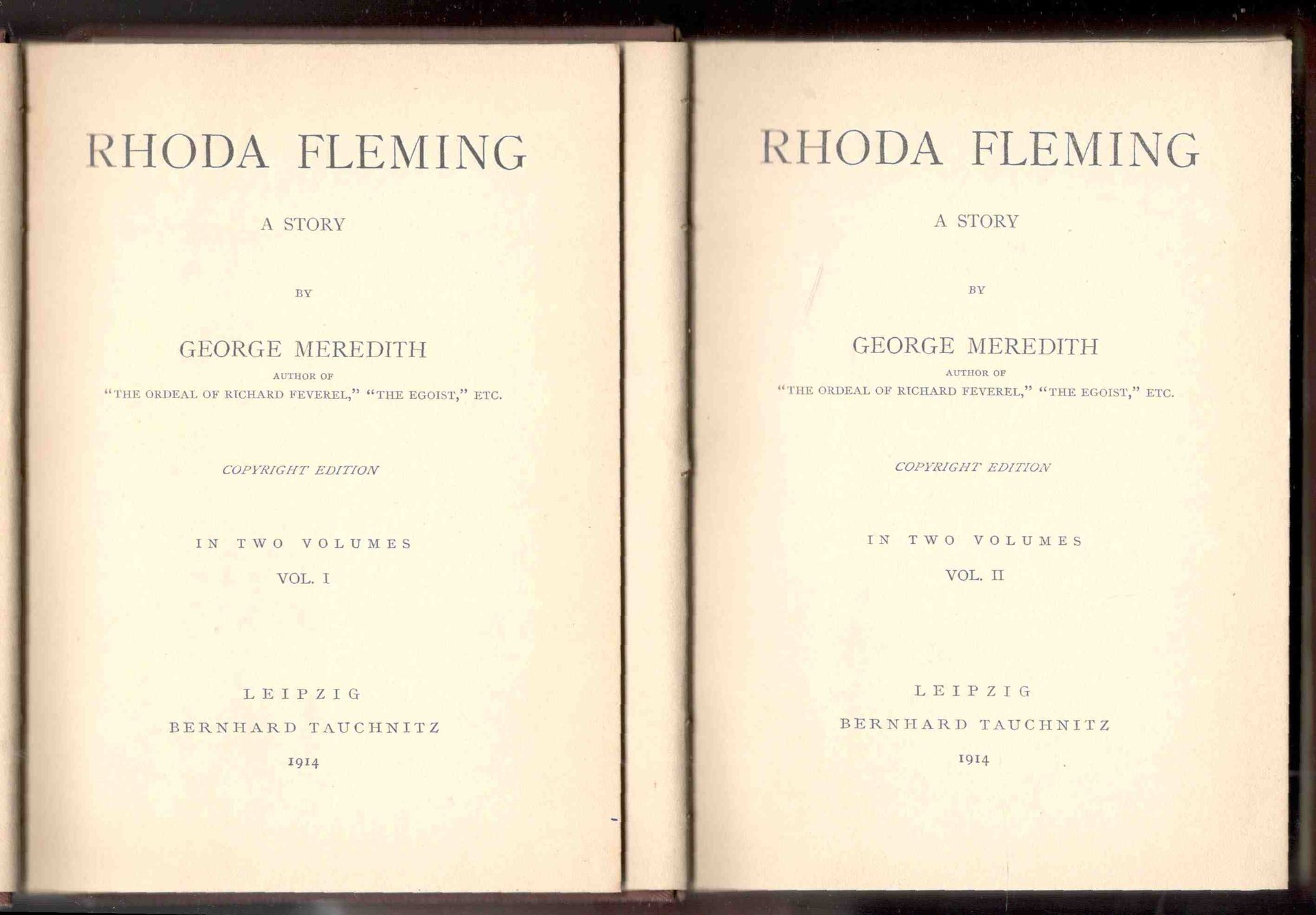 Due volumi in 16°, pp. 272; 272. Piena tela marrone dell'inizio del XX secolo con titoli oro sul dorso. Copia in buono stato. Collection of British and American Authors, Vol. 4504 - 4505. Copyright edition.