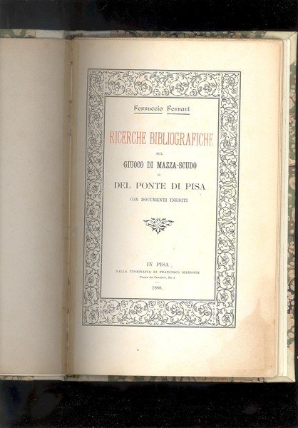 IN 8°, pp. XIV, 63 + UNA TAV.f.t.LEGATURA ALL'ANTICA IN MEZZA PERGAMENA. PIATTI MARMORIZZATI, ANGOLI IN PERGAMENA. FAMOSA BIBLIOGRAFIA SUL MAZZA - SCUDO,<BR>GIUOCO CHE PRECEDETTE QUELLO DEL PONTE DI PISA. OTTIMA CONSERVAZIONE.ID 25