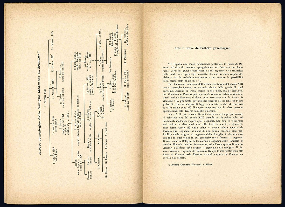 In 8vo (mm 251x172); pp. 40, con albero genealogico della famiglia Modenese da Romana nel testo. Brossura editoriale stampata. Dedica dell'autore al "Sig. Arch. Franchini" al margine superiore della copertina anteriore. Carta leggermente ed uniformemente brunita.