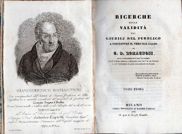 Ricerche sulla validita dei giudicj del pubblico a discernere il vero dal falso di G. D. Romagnosi. Tomo primo e secondo. | Libri antichi e moderni | G. D. Romagnosi, ,G. D. Romagnosi