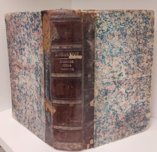 In 8, due volumi rilegati in uno di pp. 347, 387. Rilegatura mezza pelle a bande strette con fregi e titoli in oro sul dorso. Tagli picchiettati. Mancanze e abrasioni sul dorso e ai lati della copertina. Interno molto fresco. Opere postume di G. D. Romagnosi 3 in ottavo Buono (Good) .